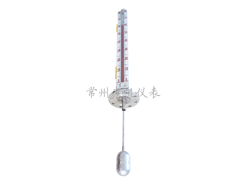基本型 液位計根據浮力原理,浮子在測量管內隨液位的升降而上、下移動,浮子內的磁鋼通過磁耦合作用,驅動紅、白色翻柱翻轉 180 。 液位上升時,翻柱由白色轉為紅色,下降時由紅色轉為白色,從而實現液位的指示。